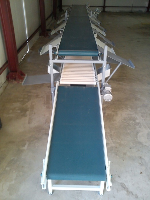 - Ραουλομεταφορέας γεμάτων κιβωτίων:Από τον προσαγωγέα τροφοδοσίας, που είναι διαμορφωμένος σε αναβατόριο τα γεμάτα κιβώτια (κλούβες) καταλήγουν σε ένα οριζόντιο ραουλομεταφορέα, που προωθεί τα κιβώτια μπροστά στις συσκευάστριες.Ο ραουλομεταφορέας αποτελείται από ράουλα μεταλλικά γαλβανισμένα και τάπες στα άκρα από ειδικό πλαστικό (για αθόρυβη λειτουργία).